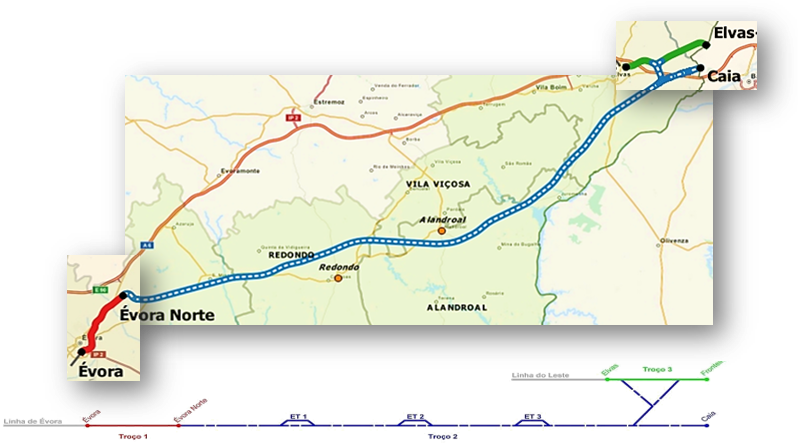 A obra em curso de construção no novo troço da Linha de Évora e Concordância de Elvas, um investimento de cerca de 338,8 milhões de euros, irá permitir uma redução do tempo de trajeto desde os Portos de Sines e Setúbal e a fronteira, bem como um aumento da capacidade.