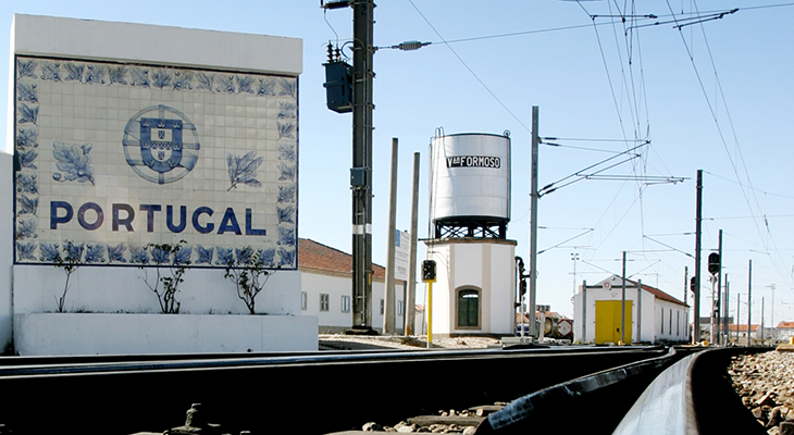 Um outro painel de grandes dimensões, o painel “PORTUGAL”, isolado no meio das linhas de entrada na estação, saúda quem vem de Espanha.