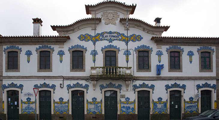 Na fachada principal aparece a identificação da Estação - Vilar Formoso, a azul sobre fundo branco, numa cartela alongada, também formada por motivos do barroco e rococó, a azul e amarelo e que é encimada pelo “Escudo da Nação”.