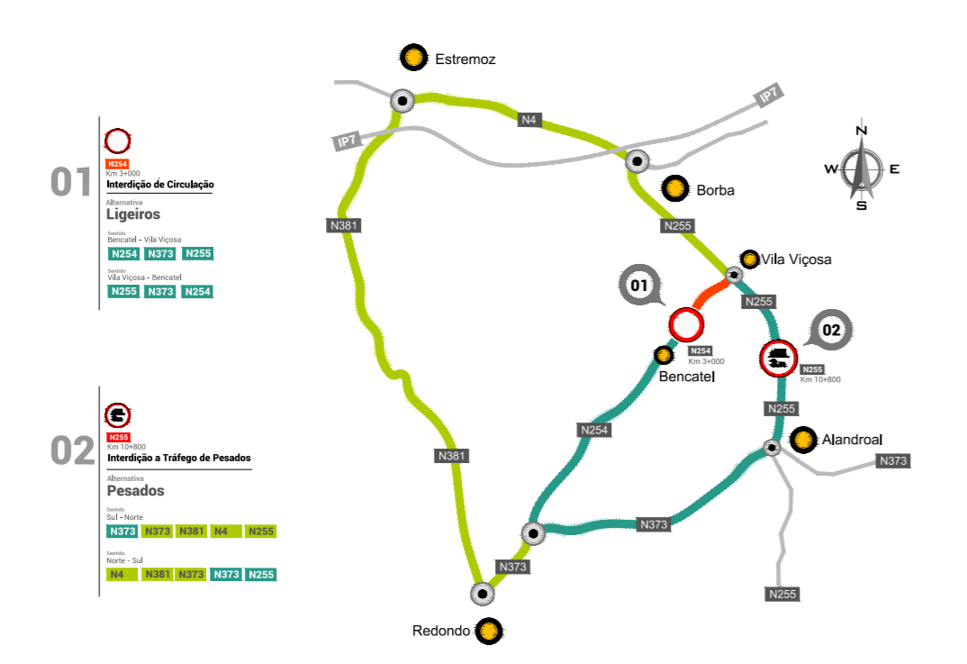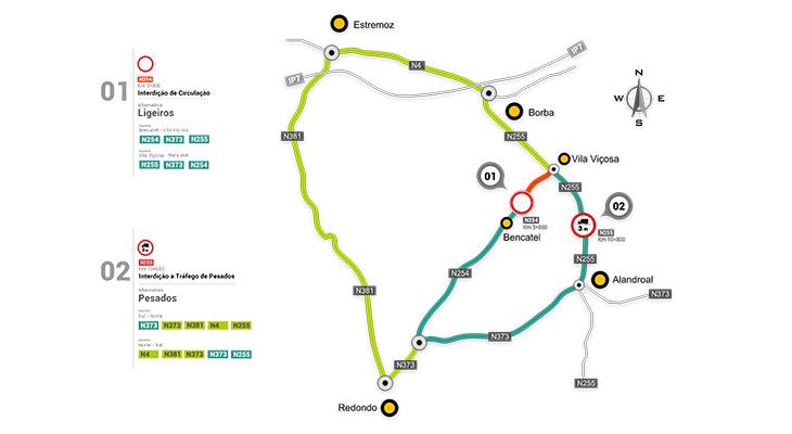 Como percurso alternativo para veículos com peso inferior a 3,5 toneladas, quer no sentido de Bencatel para Vila Viçosa, quer no sentido inverso, deverá ser utilizada a EN 255 entre Vila Viçosa e o Alandroal.