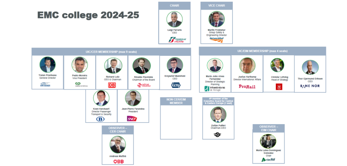 O EMC, para o qual a IP foi agora nomeada para o biénio 2024 - 2025, constitui um comité mais restrito, composto por altos representantes das empresas membros da UIC Europa, num número variável (entre 13 e 17) de membros das empresas ferroviárias europeias. Este comité, que se reúne regularmente, prepara, entre outros aspetos, as decisões estratégicas e recomendações sobre a atividade a desenvolver pela Região Europeia da UIC.